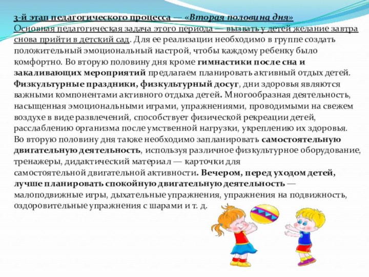 снова прийти в детский сад. Для ее реализации необходимо в группе создать положительный эмоциональный настрой, чтобы каждому ребенку было комфортно. Во вторую половину дня кроме гимнастики после сна и закаливающих мероприятий предлагаем планировать активный отдых детей. Физкультурные праздники, физкультурный досуг, дни здоровья являются важными компонентами активного отдыха детей. Многообразная деятельность, насыщенная эмоциональными играми, упражнениями, проводимыми на свежем воздухе в виде развлечений, способствует физической рекреации детей, расслаблению организма после умственной нагрузки, укреплению их здоровья.