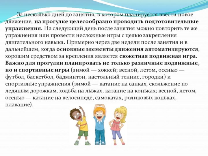 Важно для прогулки планировать не только различные подвижные, но и спортивные игры (зимой — хоккей; весной, летом, осенью — футбол, баскетбол, бадминтон, настольный теннис, городки) и спортивные упражнения (зимой — катание на санках, скольжение по ледяным дорожкам, ходьба на лыжах, катание на коньках; весной, летом, осенью — катание на велосипеде, самокатах, роликовых коньках, плавание).