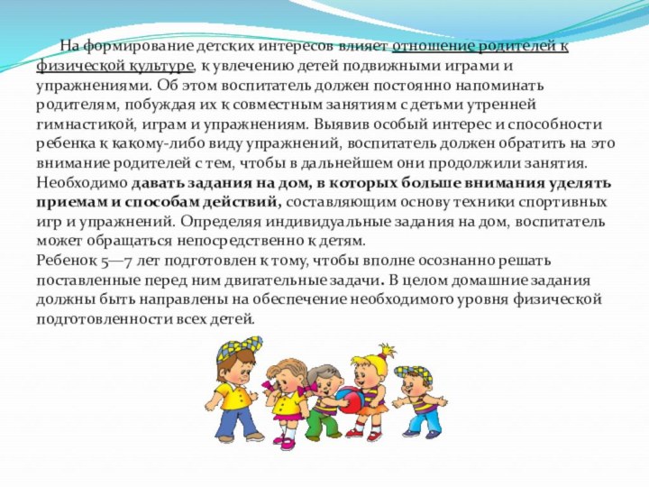 играми и упражнениями. Об этом воспитатель должен постоянно напоминать родителям, побуждая их к совместным занятиям с детьми утренней гимнастикой, играм и упражнениям. Выявив особый интерес и способности ребенка к какому-либо виду упражнений, воспитатель должен обратить на это внимание родителей с тем, чтобы в дальнейшем они продолжили занятия. Необходимо давать задания на дом, в которых больше внимания уделять приемам и способам действий, составляющим основу техники спортивных игр и упражнений. Определяя индивидуальные задания на дом, воспитатель может обращаться непосредственно к детям.