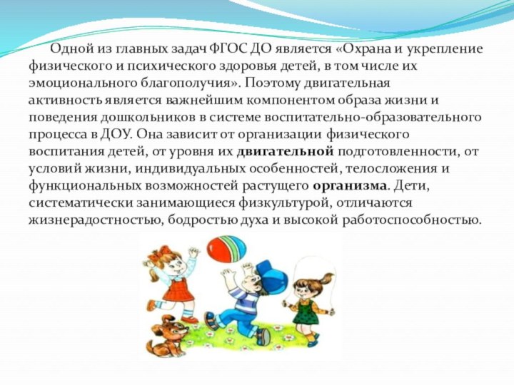 детей, в том числе их эмоционального благополучия». Поэтому двигательная активность является важнейшим компонентом образа жизни и поведения дошкольников в системе воспитательно-образовательного процесса в ДОУ. Она зависит от организации физического воспитания детей, от уровня их двигательной подготовленности, от условий жизни, индивидуальных особенностей, телосложения и функциональных возможностей растущего организма. Дети, систематически занимающиеся физкультурой, отличаются жизнерадостностью, бодростью духа и высокой работоспособностью.