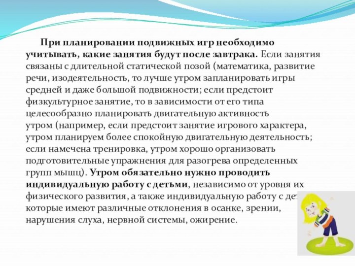 с длительной статической позой (математика, развитие речи, изодеятельность, то лучше утром запланировать игры средней и даже большой подвижности; если предстоит физкультурное занятие, то в зависимости от его типа целесообразно планировать двигательную активность утром (например, если предстоит занятие игрового характера, утром планируем более спокойную двигательную деятельность; если намечена тренировка, утром хорошо организовать подготовительные упражнения для разогрева определенных групп мышц). Утром обязательно нужно проводить индивидуальную работу с детьми, независимо от уровня их физического развития, а также индивидуальную работу с детьми, которые имеют различные отклонения в осанке, зрении, нарушения слуха, нервной системы, ожирение.
