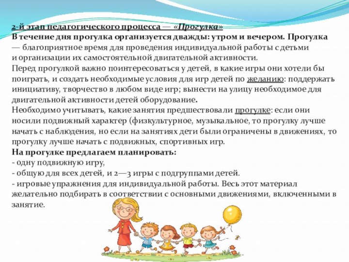 Перед прогулкой важно поинтересоваться у детей, в какие игры они хотели бы поиграть, и создать необходимые условия для игр детей по желанию: поддержать инициативу, творчество в любом виде игр; вынести на улицу необходимое для двигательной активности детей оборудование.