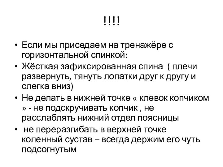 Не делать в нижней точке « клевок копчиком » - не подскручивать копчик , не расслаблять нижний отдел поясницы