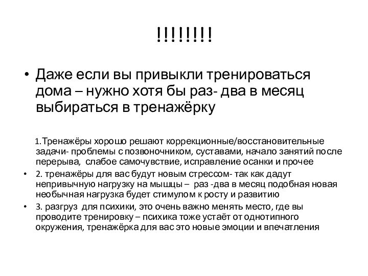 1.Тренажёры хорошо решают коррекционные/восстановительные задачи- проблемы с позвоночником, суставами, начало занятий после перерыва, слабое самочувствие, исправление осанки и прочее
