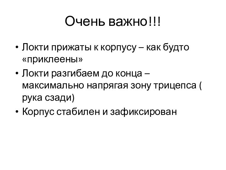 Локти разгибаем до конца – максимально напрягая зону трицепса