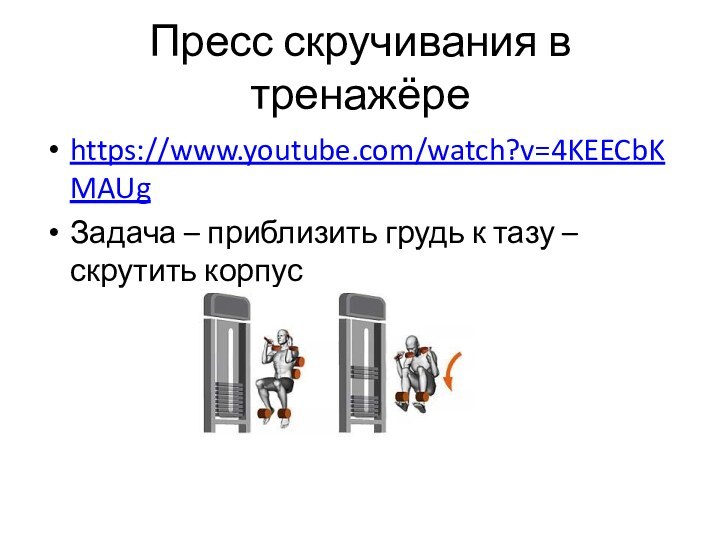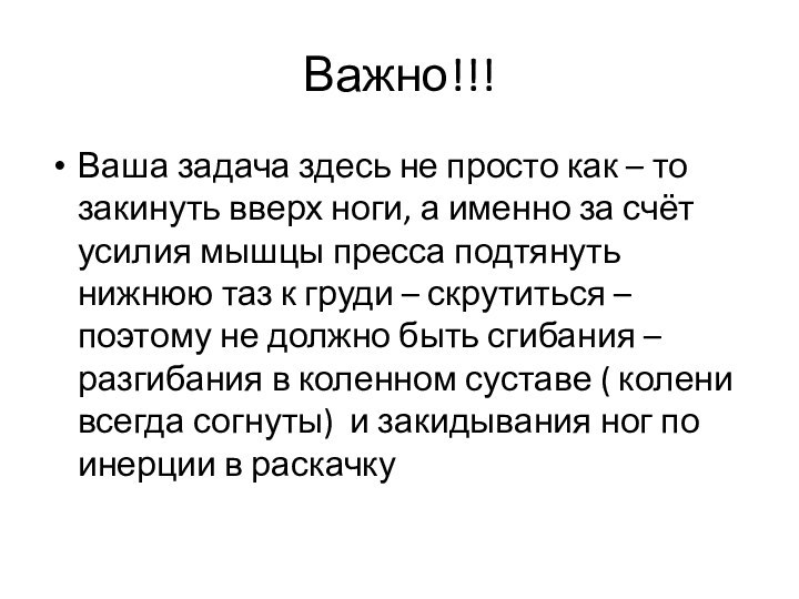 пресса подтянуть нижнюю таз к груди – скрутиться – поэтому не должно быть сгибания –разгибания в коленном суставе ( колени всегда согнуты) и закидывания ног по инерции в раскачку