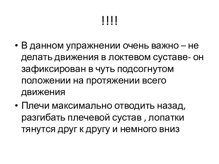 Плечи максимально отводить назад, разгибать плечевой сустав , лопатки тянутся друг к другу и немного вниз