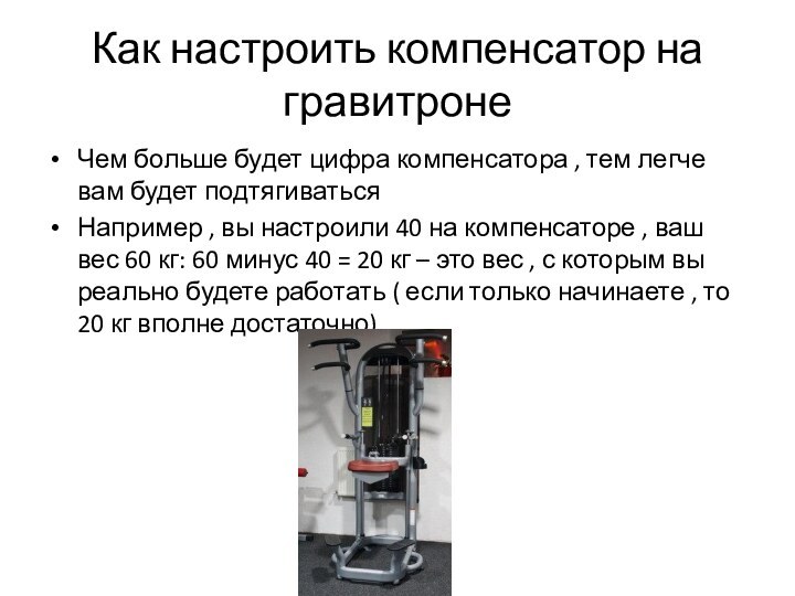 вы настроили 40 на компенсаторе , ваш вес 60 кг: 60 минус 40 = 20 кг – это вес , с которым вы реально будете работать ( если только начинаете , то 20 кг вполне достаточно)