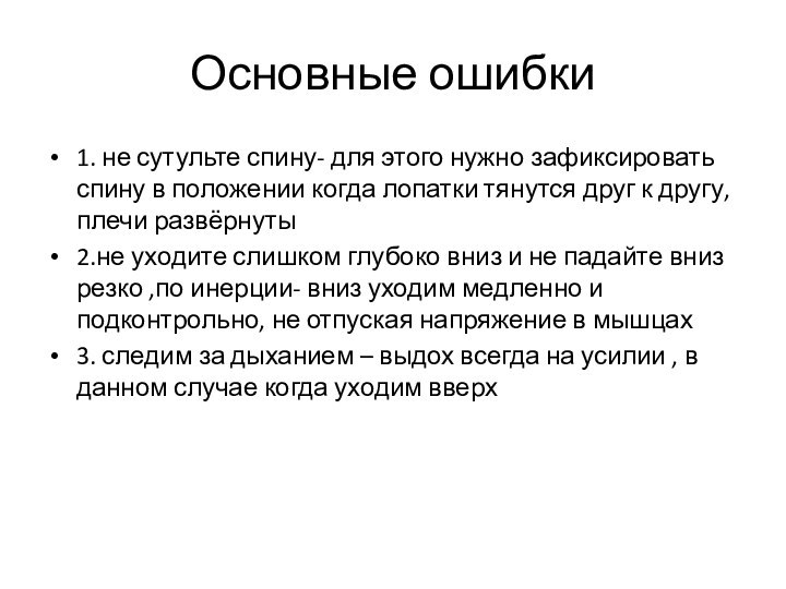 2.не уходите слишком глубоко вниз и не падайте вниз резко ,по инерции- вниз уходим медленно и подконтрольно, не отпуская напряжение в мышцах