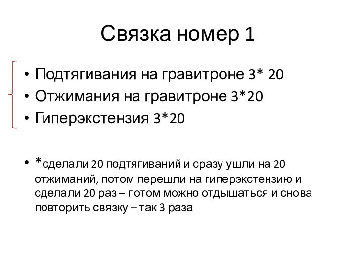сразу ушли на 20 отжиманий, потом перешли на гиперэкстензию и сделали 20 раз – потом можно отдышаться и снова повторить связку – так 3 раза