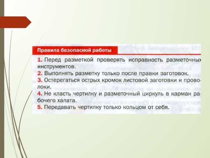 Цель урока Научить учащихся различным приемам разметки деталей из дерева. Освоить различные виды инструментов для слесарной разметки, их назначение и применение.