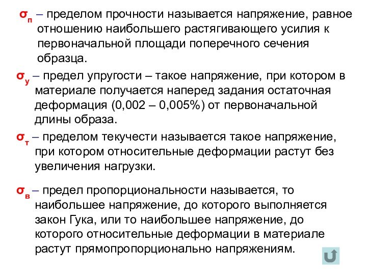 σу – предел упругости – такое напряжение, при котором в материале получается наперед задания остаточная деформация (0,002 – 0,005%) от первоначальной длины образа.