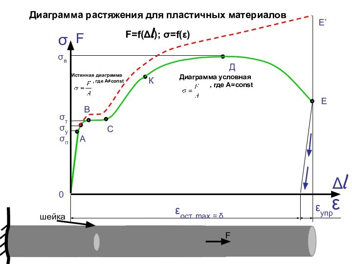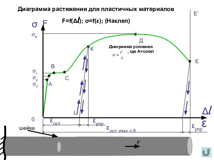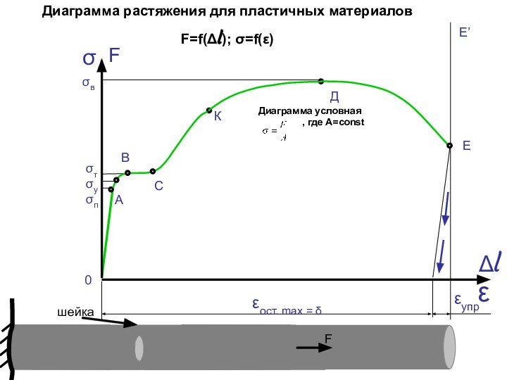 σп – пределом прочности называется напряжение, равное отношению наибольшего растягивающего усилия к первоначальной площади поперечного сечения образца.