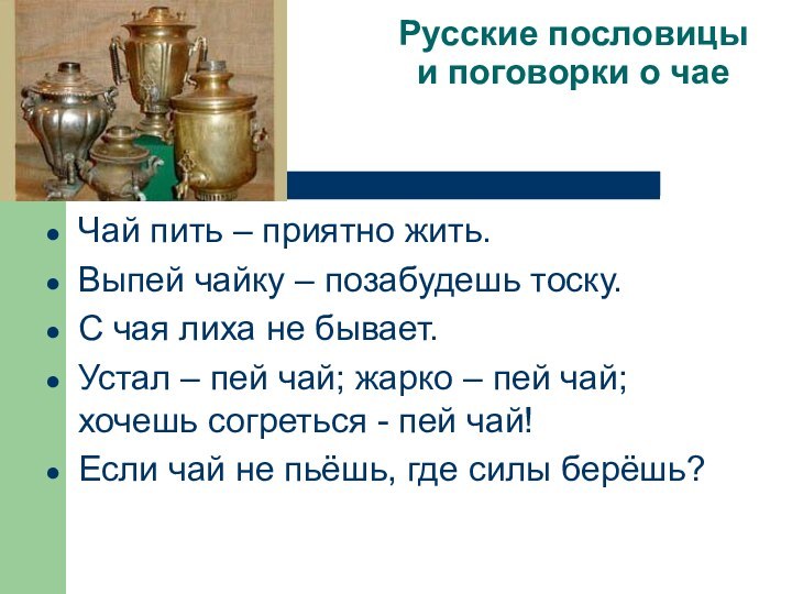 Устал – пей чай; жарко – пей чай; хочешь согреться - пей чай!