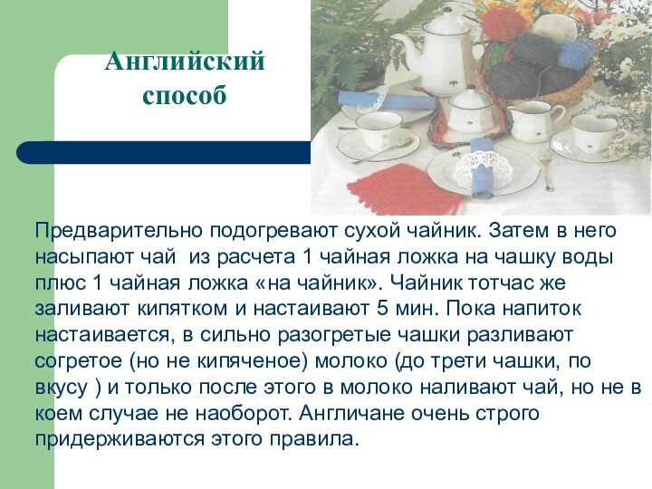 воды плюс 1 чайная ложка «на чайник». Чайник тотчас же заливают кипятком и настаивают 5 мин. Пока напиток настаивается, в сильно разогретые чашки разливают согретое (но не кипяченое) молоко (до трети чашки, по вкусу ) и только после этого в молоко наливают чай, но не в коем случае не наоборот. Англичане очень строго придерживаются этого правила.