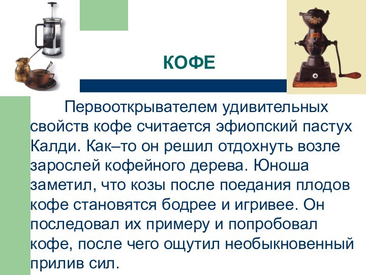 свойств кофе считается эфиопский пастух Калди. Как–то он решил