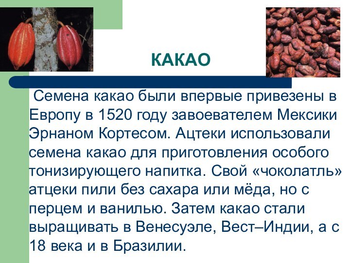 использовали семена какао для приготовления особого тонизирующего напитка. Свой «чоколатль» атцеки пили без сахара или мёда, но с перцем и ванилью. Затем какао стали выращивать в Венесуэле, Вест–Индии, а с 18 века и в Бразилии.