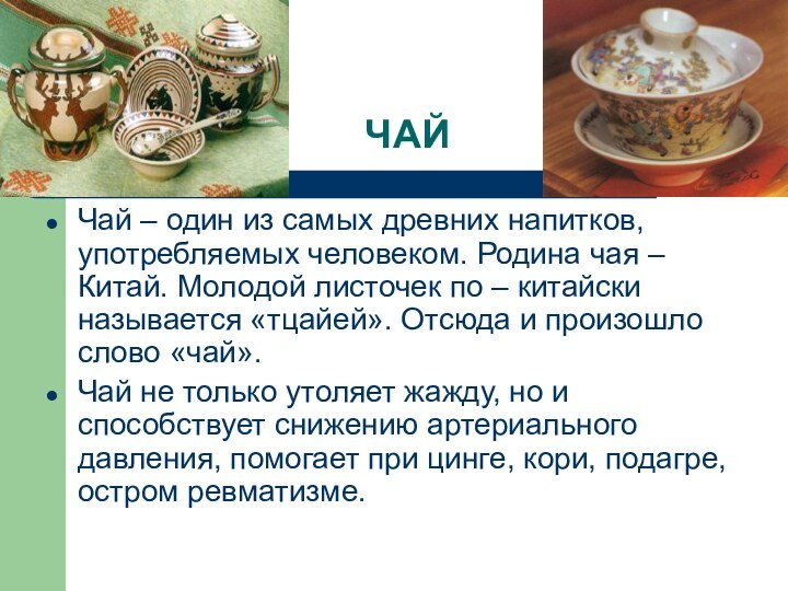 Чай не только утоляет жажду, но и способствует снижению артериального давления, помогает при цинге, кори, подагре, остром ревматизме.