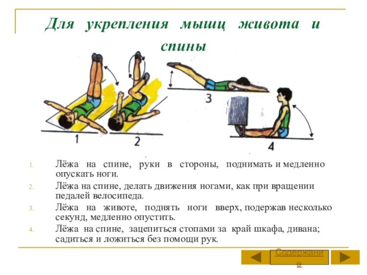 Лёжа на спине, зацепиться стопами за край шкафа, дивана; садиться и ложиться без помощи рук.