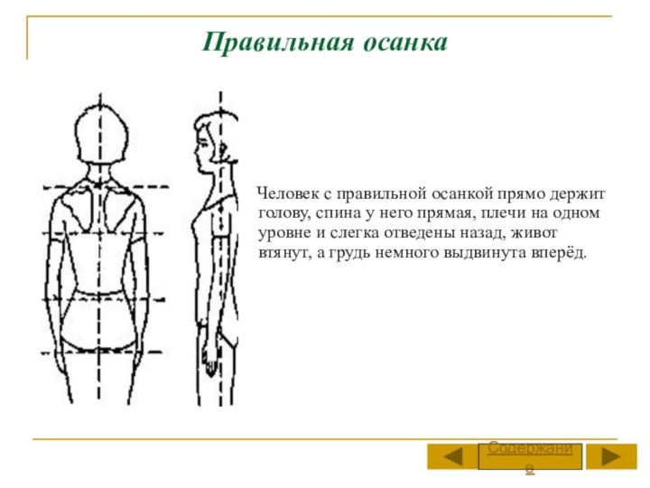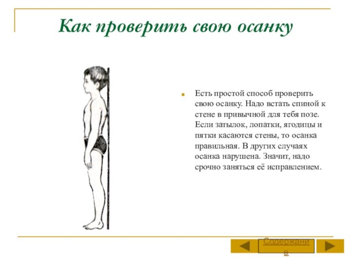 тебя позе. Если затылок, лопатки, ягодицы и пятки касаются стены, то осанка правильная. В других случаях осанка нарушена. Значит, надо срочно заняться её исправлением.