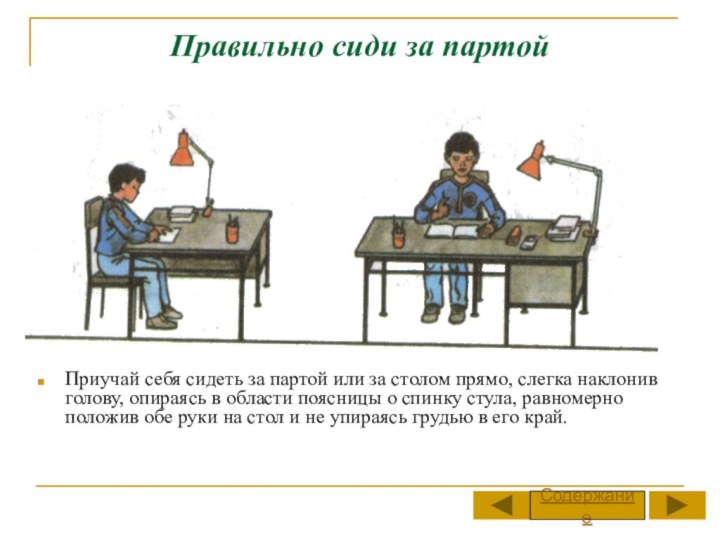 области поясницы о спинку стула, равномерно положив обе руки на стол и не упираясь грудью в его край.