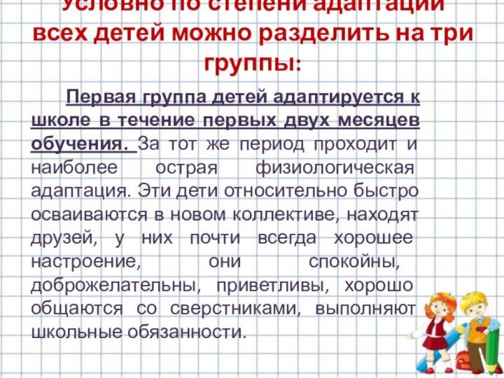 Условно по степени адаптации всех детей можно разделить на три группы: