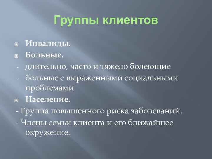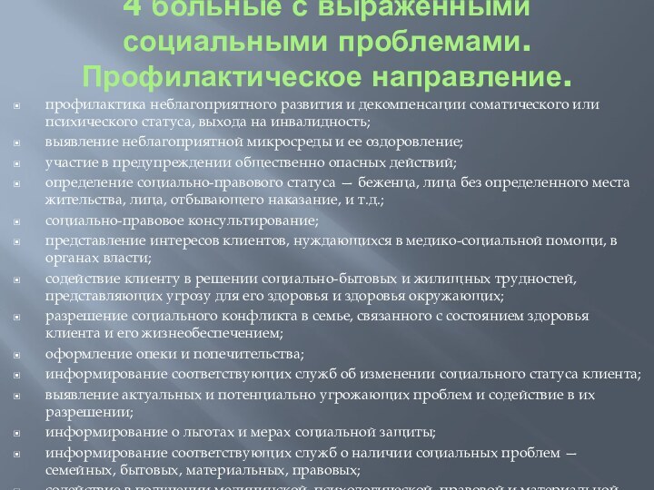 4 больные с выраженными социальными проблемами. Профилактическое направление.