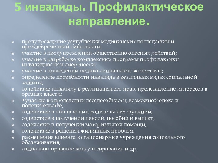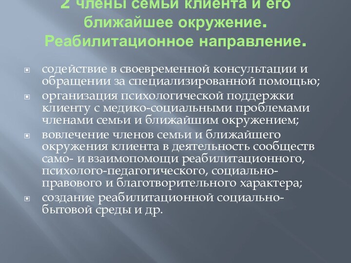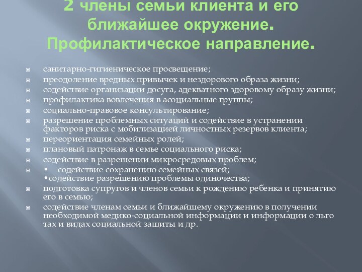 содействие членам семьи и ближайшему окружению в получении необходимой медико-социальной информации и информации о льготах и видах социальной защиты и др.