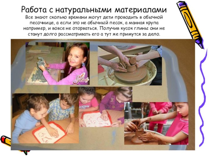 Работа с натуральными материалами Все знают сколько времени могут дети проводить в обычной песочнице, а если это не обычный песок, а манная крупа например, и вовсе не оторваться. Получив кусок глины они не станут долго рассматривать