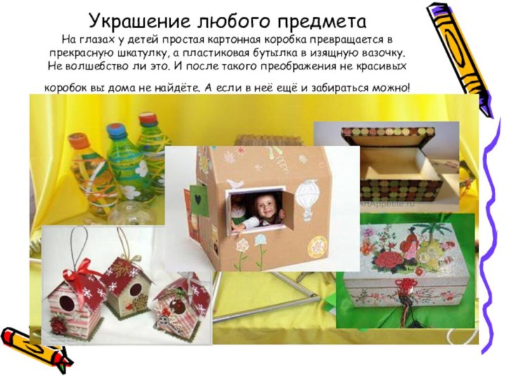 Слайд 5 Украшение любого предмета На глазах у детей простая картонная