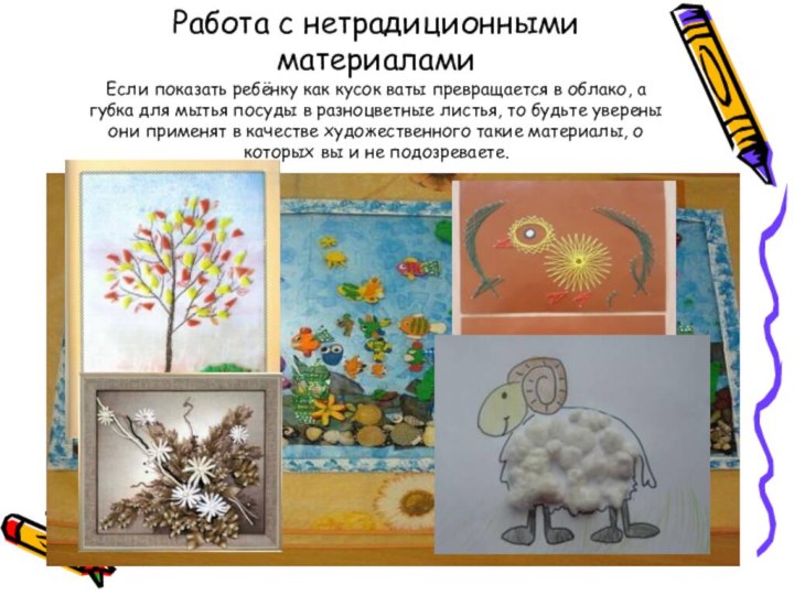 Слайд 3 Работа с нетрадиционными материалами Если показать ребёнку как кусок