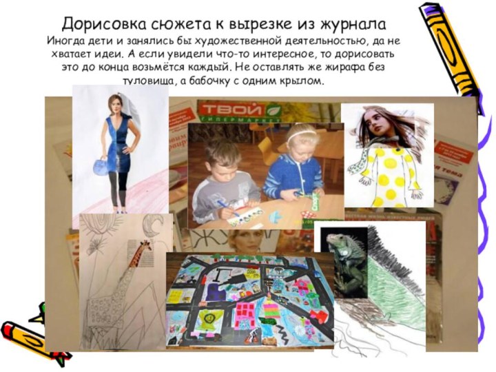 Слайд 4 Дорисовка сюжета к вырезке из журнала Иногда дети