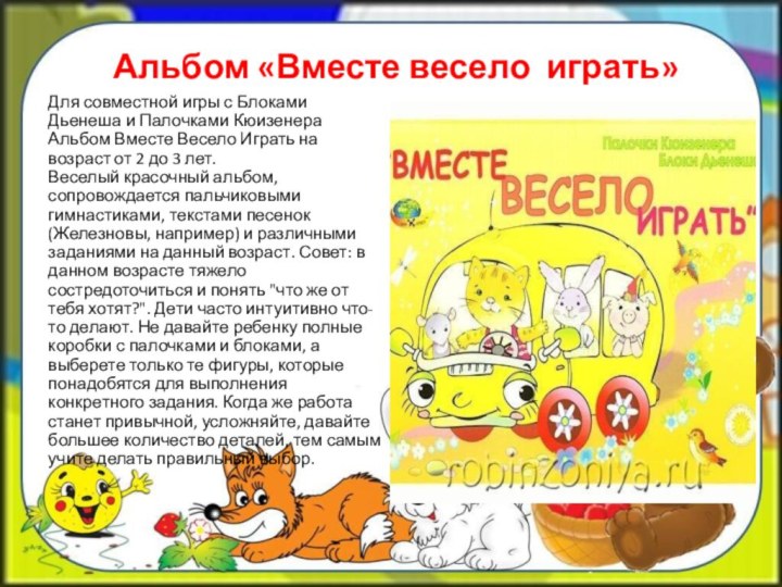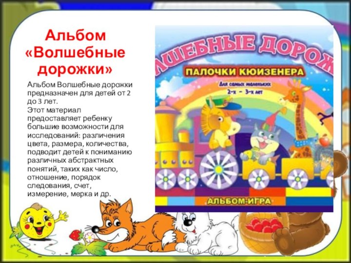 Альбом «Волшебные дорожки»Альбом Волшебные дорожки предназначен для детей от 2 до 3 лет. Этот материал предоставляет ребенку большие возможности для исследований: различения цвета, размера, количества, подводит детей к пониманию различных абстрактных понятий, таких как число, отношение,