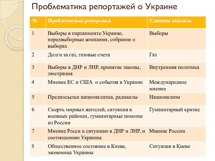 Контент-анализ программы «Вести недели» ВведениеОбъект анализа: программа «Вести недели», выпускающая по воскресениям.Предмет анализа: репормажи, касающиеся о Количественный анализ (вопросы Украины в соотношении всей программы) Проблематика репортажей о Украине Рейтинг проблематик репортажей, касающихся о Украине Рейтинг проблематик репортажей по месяцам Результаты анализаПрограмма выделила наиболее вниманиях на событие в УкраинеСреди проблематиках, канал интересует