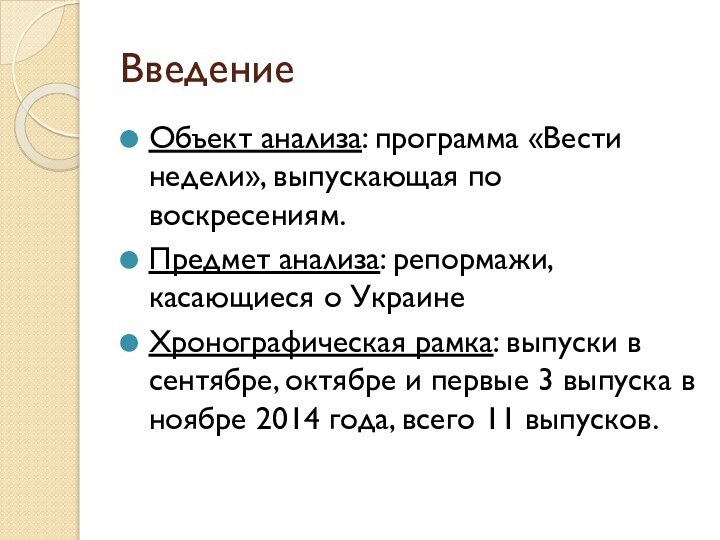ВведениеОбъект анализа: программа «Вести недели», выпускающая по воскресениям.Предмет анализа: репормажи, касающиеся о УкраинеХронографическая рамка: выпуски в сентябре, октябре и первые 3 выпуска в ноябре 2014 года, всего 11 выпусков.
