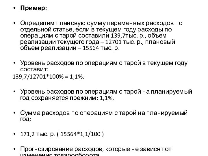 Для измерения влияния динамики товарооборота на издержки обращения делают пересчет плановых расходов на фактический товарооборот. По переменным статьям издержек считают, что с перевыполнением плана розничного товарооборота пропорционально возрастают их суммы, а уровень остается неизменным – плановым.