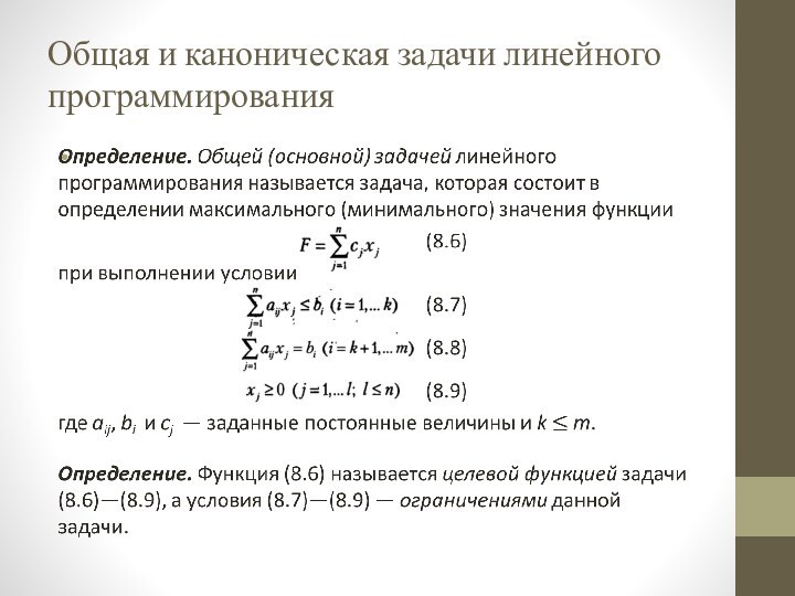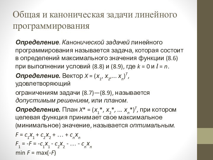 Определение. План X* = (х1*, х2*, ... хn*)T, при котором целевая функция принимает свое максимальное (минимальное) значение, называется оптимальным.