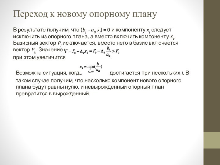 таком случае получим, что несколько компонент нового опорного плана будут равны нулю, и невырожденный опорный план превратится в вырожденный.