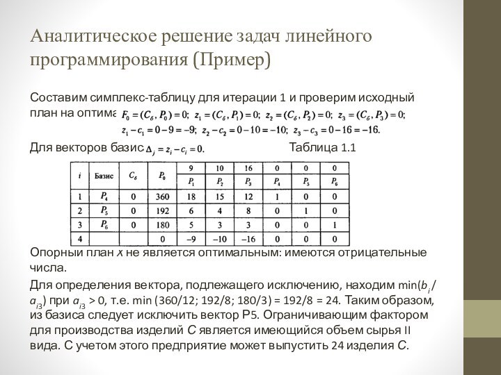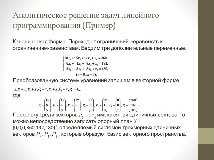 Поскольку среди векторов P1, ... P6 имеются три единичных вектора, то можно непосредственно записать опорный план X = (0,0,0,360,192,180)T, определяемый системой трехмерных единичных векторов Р4, Р5, Р6 , которые образуют базис векторного пространства.