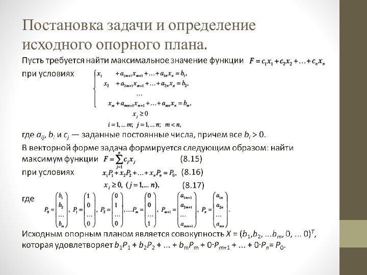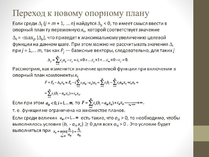 следует исключить из опорного плана, а вместо включить компоненту хk. Базисный вектор Pl исключается, вместо него в базис включается вектор Pk. Значение функции