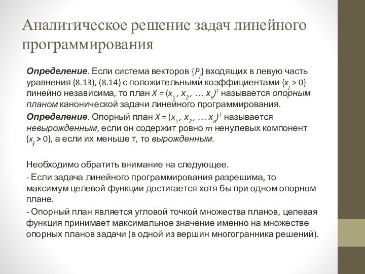 Определение. Опорный план X = (x1 , х2 , … хn)T называется невырожденным, если он содержит ровно m ненулевых компонент {xj > 0}, а если их меньше т, то вырожденным.