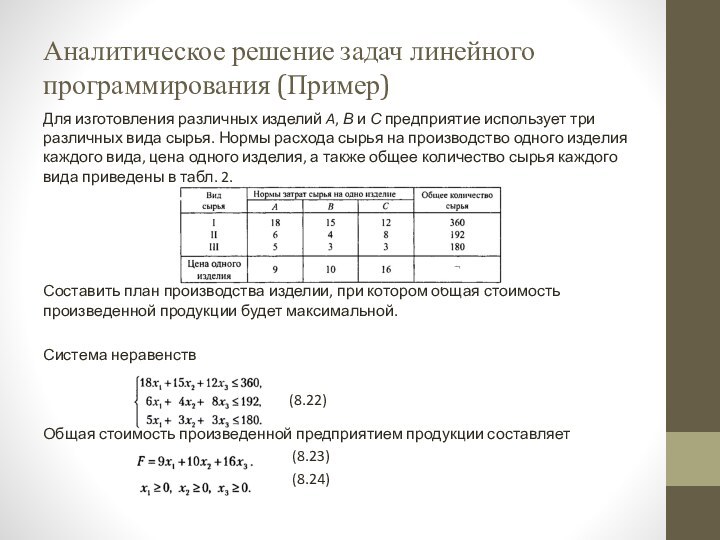 вида сырья. Нормы расхода сырья на производство одного изделия каждого вида, цена одного изделия, а также общее количество сырья каждого вида приведены в табл. 2.