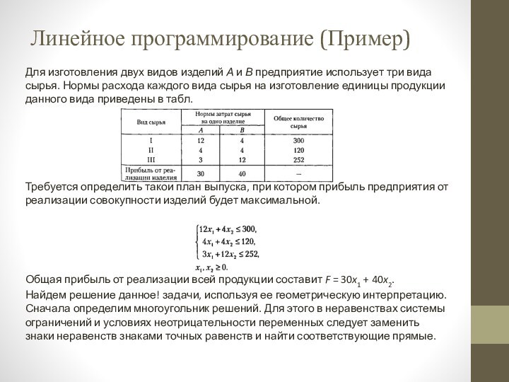 Общая прибыль от реализации всей продукции составит F = 30x1 + 40x2.