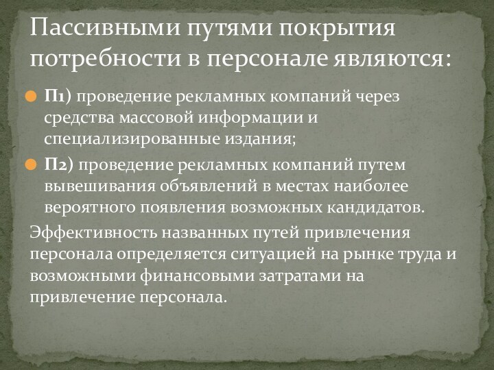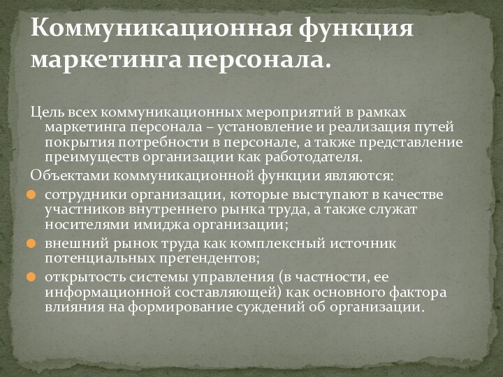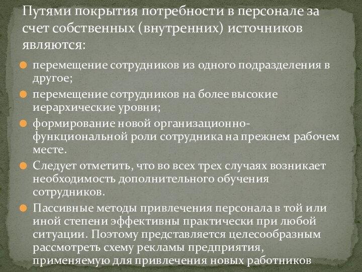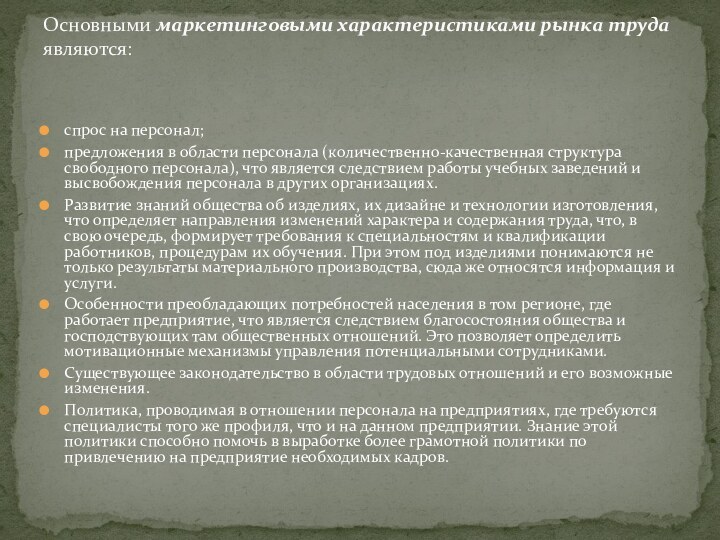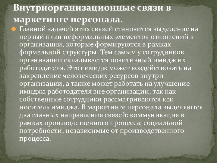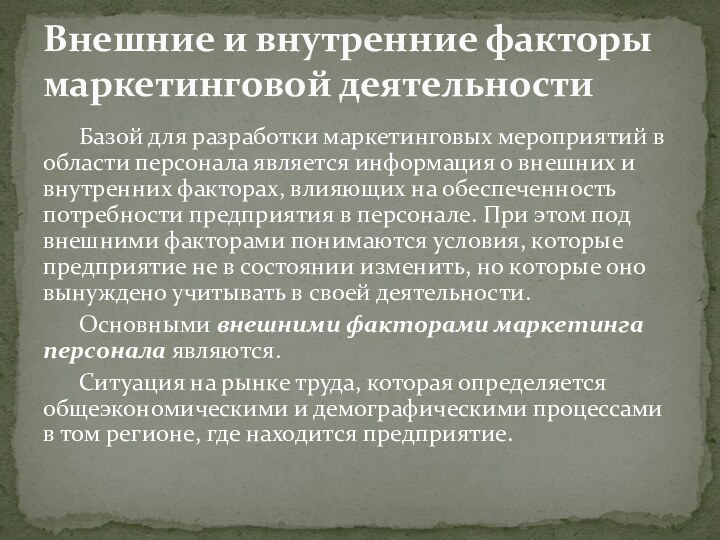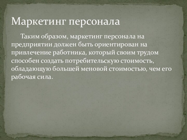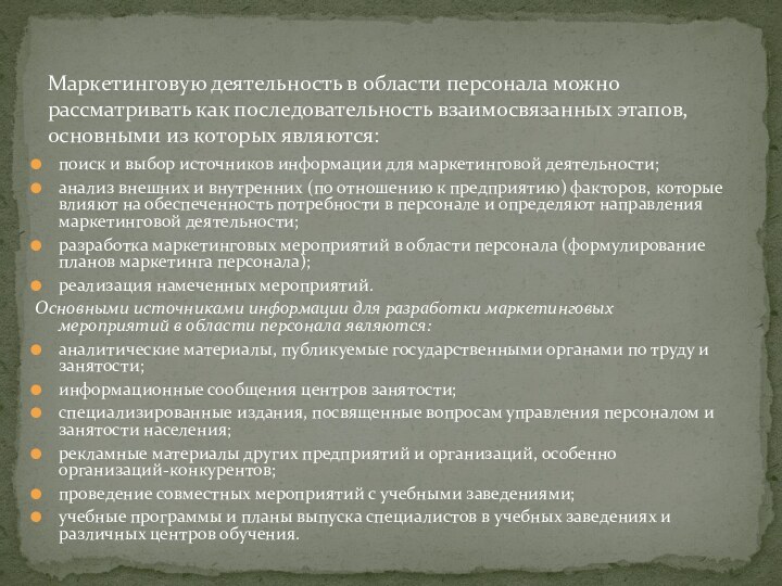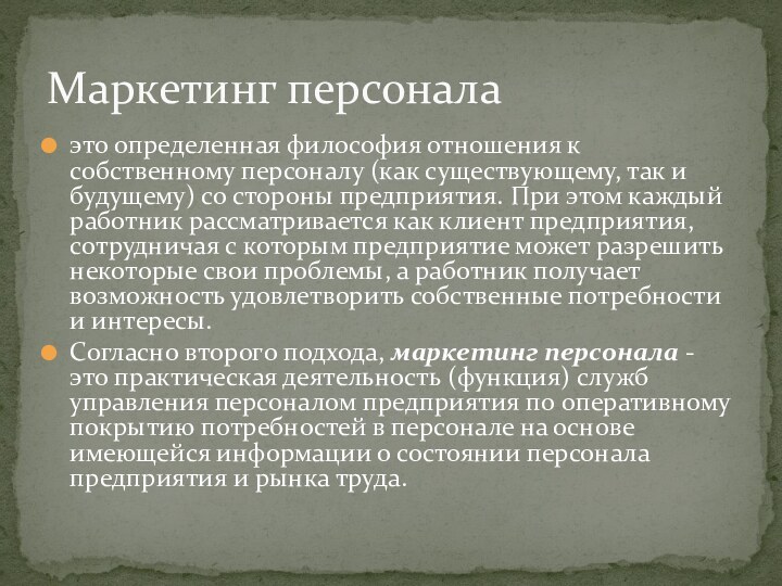 каждый работник рассматривается как клиент предприятия, сотрудничая с которым предприятие может разрешить некоторые свои проблемы, а работник получает возможность удовлетворить собственные потребности и интересы.Согласно второго подхода, маркетинг персонала - это практическая деятельность (функция) служб управления персоналом предприятия по оперативному покрытию потребностей в персонале на основе имеющейся информации о состоянии персонала предприятия и рынка труда.