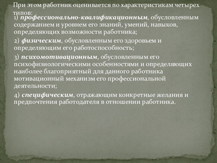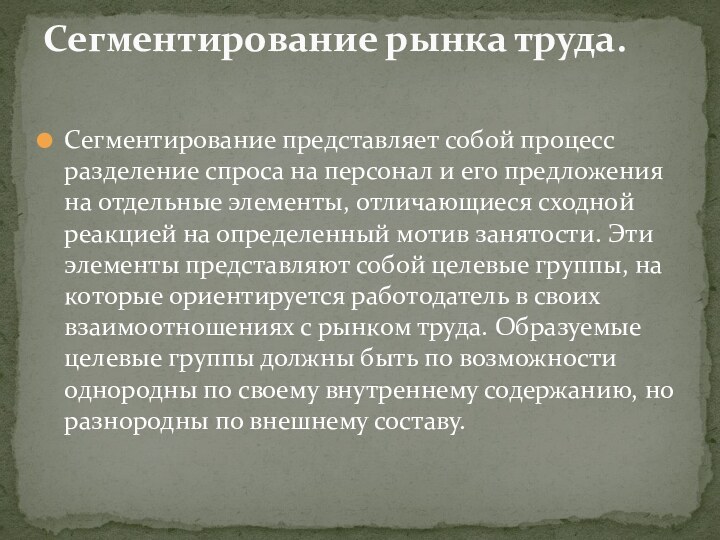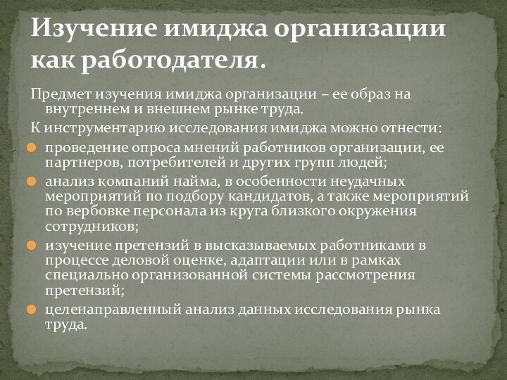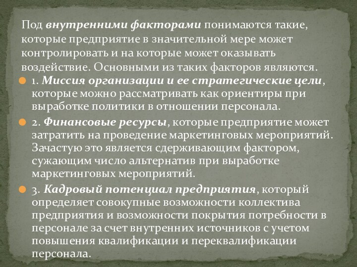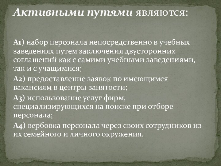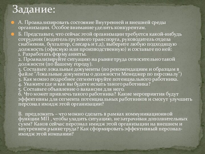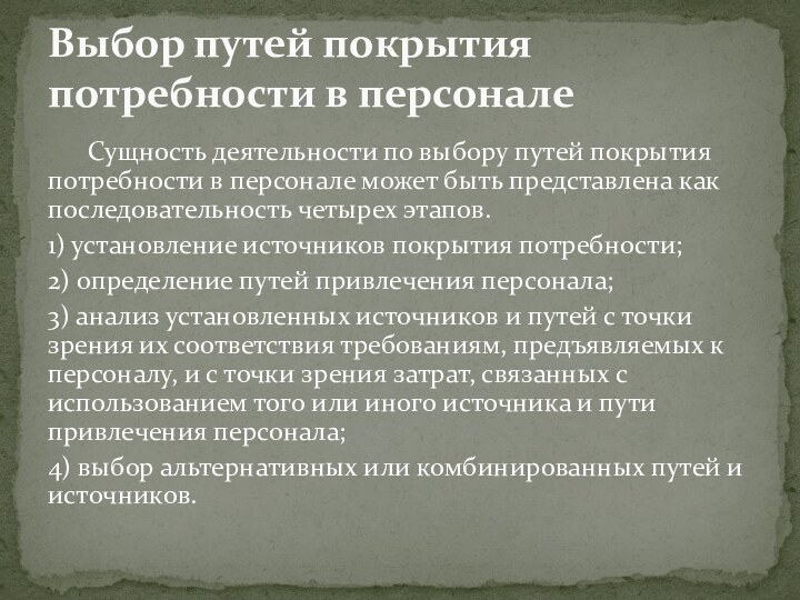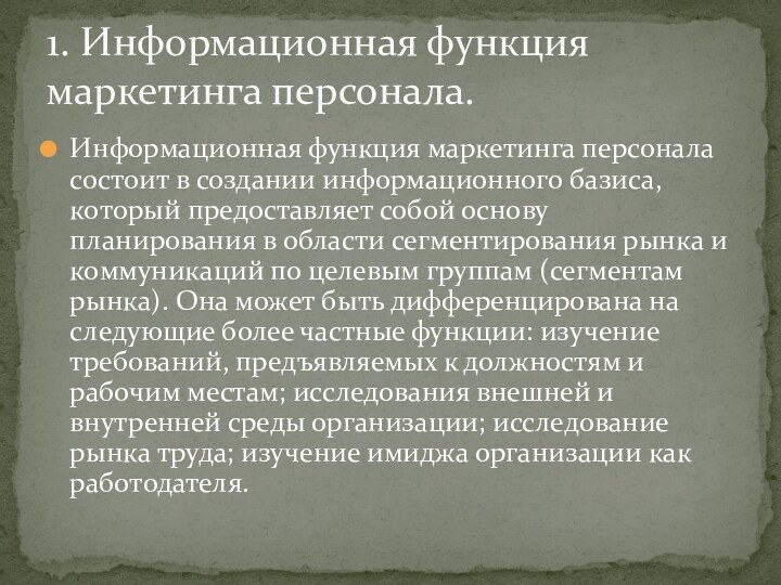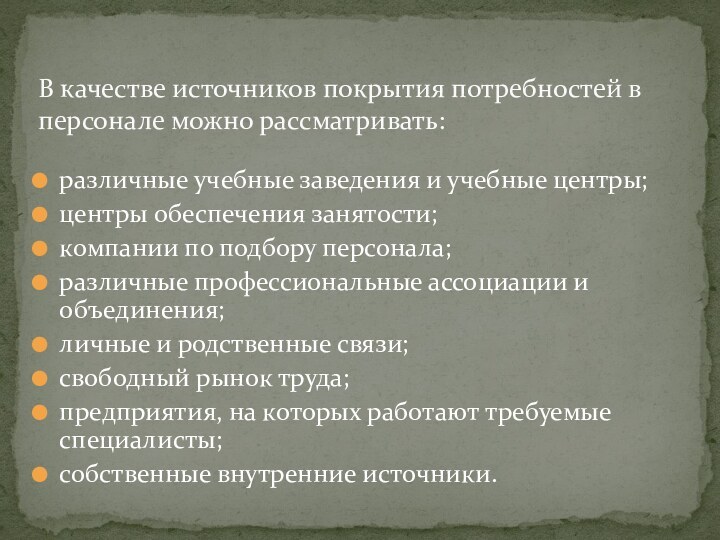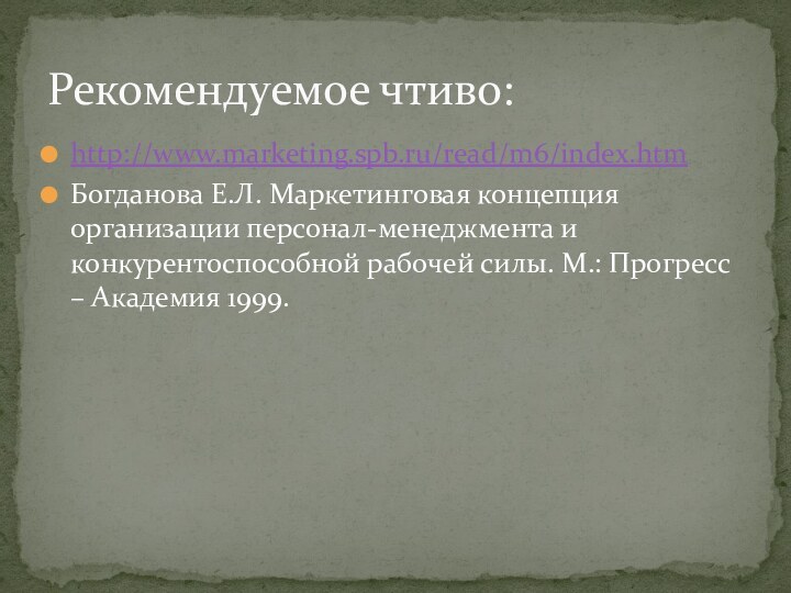 каждый работник рассматривается как клиент предприятия, сотрудничая с которым предприятие может разрешить некоторые свои проблемы, а работник получает возможность удовлетворить собственные потребности и интересы.Согласно второго подхода, маркетинг персонала - это практическая деятельность (функция) служб управления персоналом предприятия по оперативному покрытию потребностей в персонале на основе имеющейся информации о состоянии персонала предприятия и рынка труда.