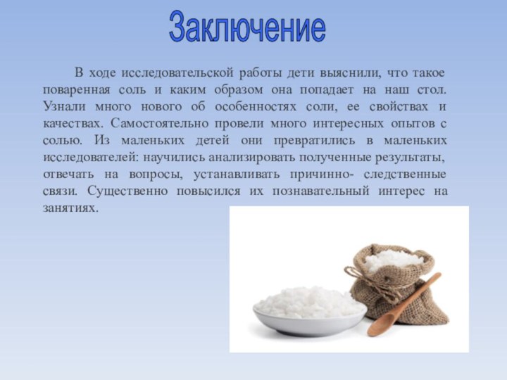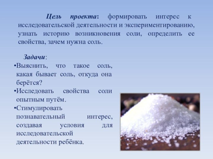 исследовательской деятельности и экспериментированию, узнать историю возникновения соли, определить