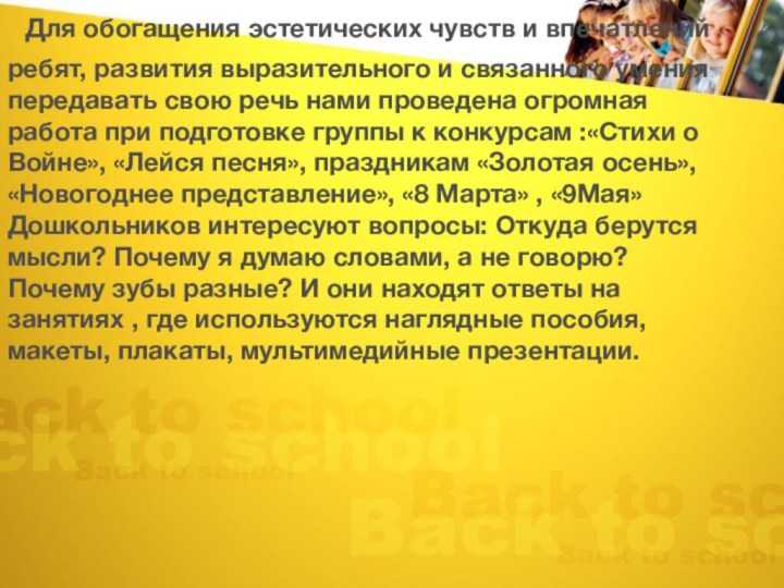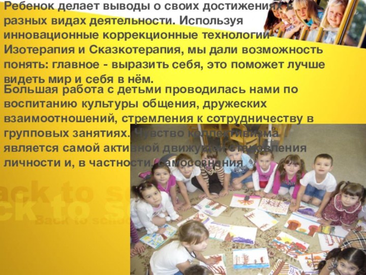 Большая работа с детьми проводилась нами по воспитанию культуры общения, дружеских взаимоотношений, стремления к сотрудничеству в групповых занятиях. Чувство коллективизма является самой активной движущей становления личности и, в частности, самосознания
