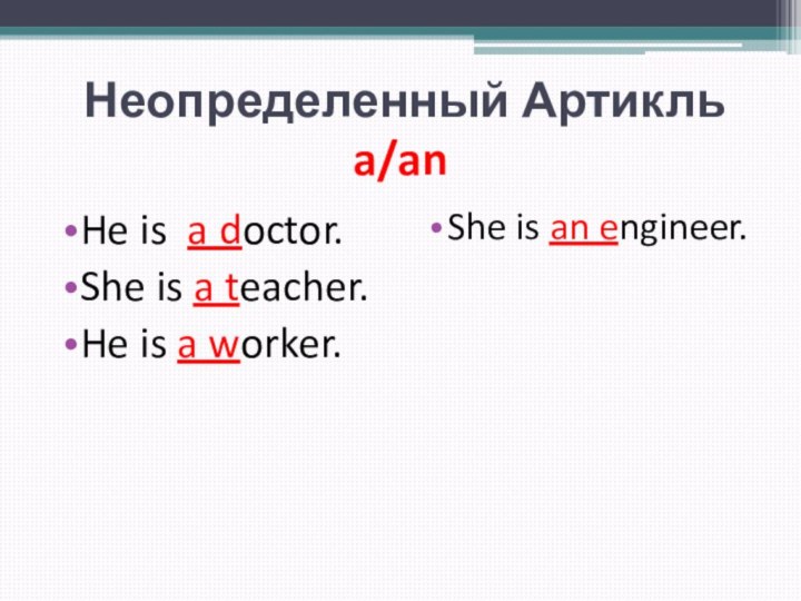 Неопределенный Артикль a/anHe is a doctor.She is a teacher.He is a worker.She is an engineer.
