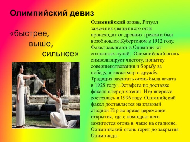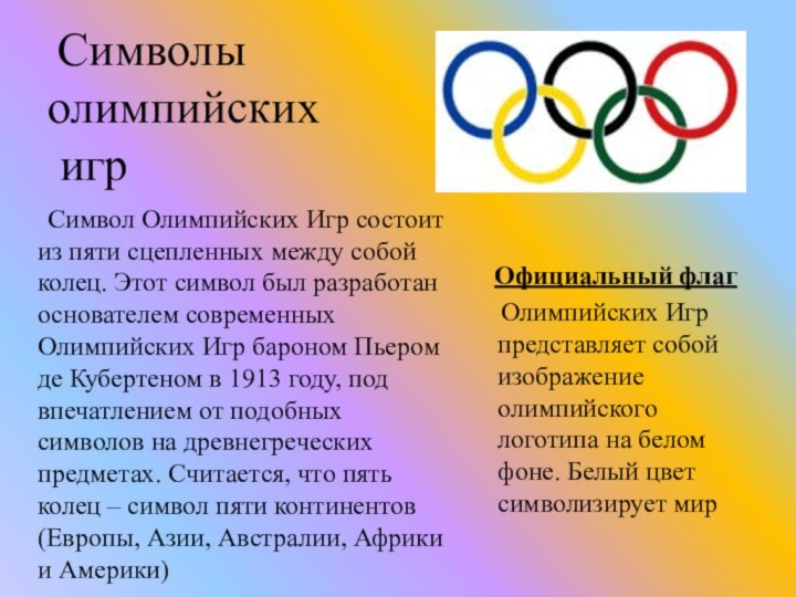 Символ Олимпийских Игр состоит из пяти сцепленных между собой колец. Этот символ был разработан основателем современных Олимпийских Игр бароном Пьером де Кубертеном в 1913 году, под впечатлением от подобных символов на древнегреческих предметах. Считается, что пять колец – символ пяти континентов (Европы, Азии, Австралии, Африки и Америки)