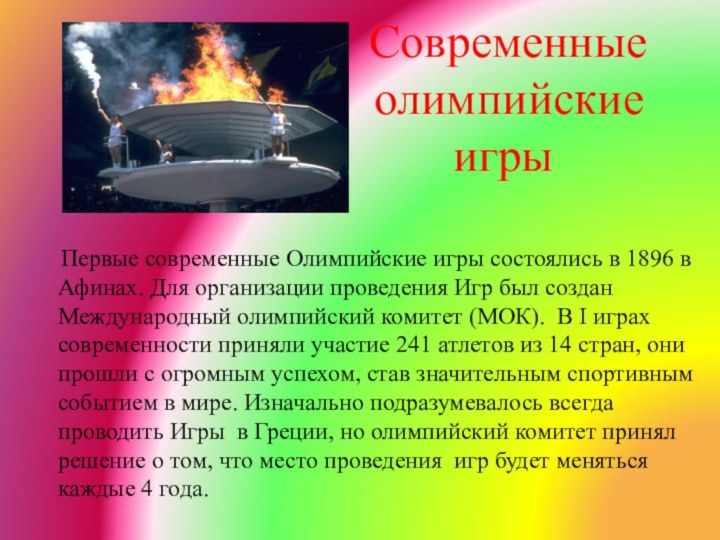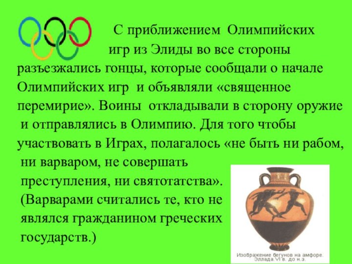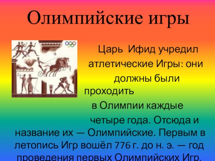 четыре года. Отсюда и название их — Олимпийские. Первым в летопись Игр вошёл 776 г. до н. э. — год проведения первых Олимпийских Игр.
